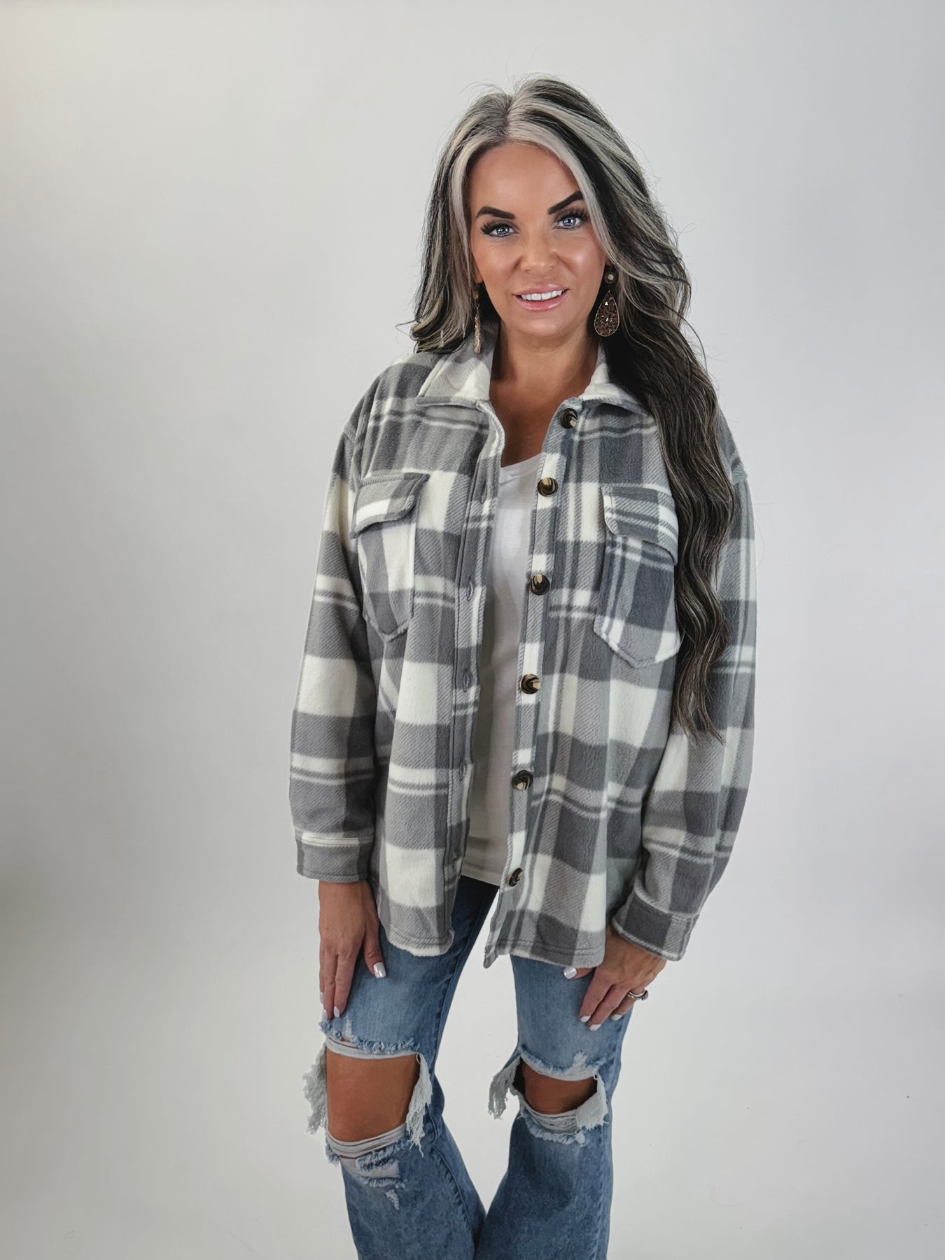 DOORBUSTER Long Sleeve Check Printed Fleece Shacket: GREY